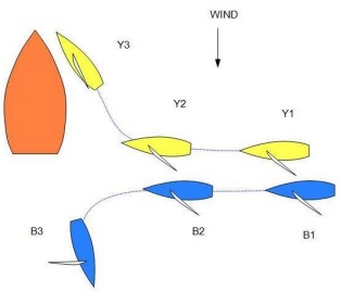 Before the start, and before approaching any starting mark to start, Yellow and Blue approach a large moored boat with Yellow half a length ahead. It appears that Blue intends to pass across the stern of the large boat, and that Yellow requires room to pass on the same side on the inside of Blue. Blue does not bear away to give room, and at the last moment Yellow avoids the large boat by luffing sharply and going to windward of it. Before the bow of Blue reaches the stern of the large boat, she gybes away so that she does not pass its stern. Flag Y is displayed. What should the call be?