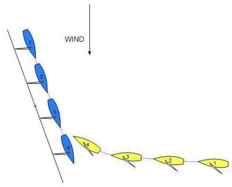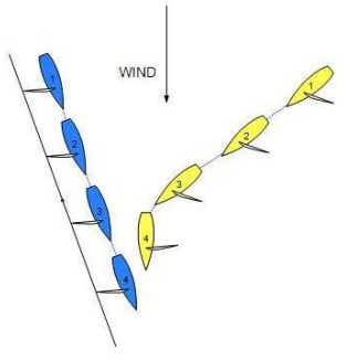 Yellow and Blue are both sailing more than ninety degrees from the true wind. Blue, on port tack is sailing along a continuing obstruction. Yellow, on starboard tack is approaching the obstruction on a collision course with Blue. Yellow bears away and avoids Blue.