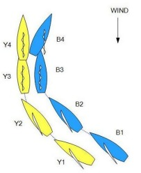 In similar circumstances, Blue responds and when head to wind, she remains so for a time. Then Yellow bears away and their sterns make contact. Flag Y is displayed. What should the call be?