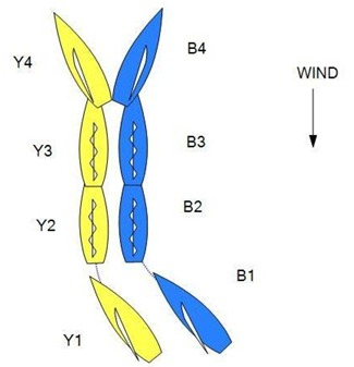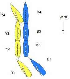 In similar circumstances, Blue keeps clear, but when head to wind, she maintains it for a time. Blue then passes head to wind, and slightly later Yellow bears away and their sterns make contact. Flag Y is displayed. What should the call be?