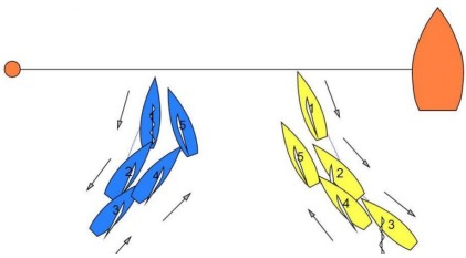 Before the start Yellow and Blue are on opposite tacks with both boats head to wind. After some time both begin moving astern.
