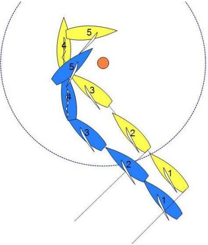 Yellow enters the zone clear ahead of Blue. Both boats tack and continue to round the mark. Blue becomes overlapped inside Yellow. Both boats display flag Y. What should the call be?