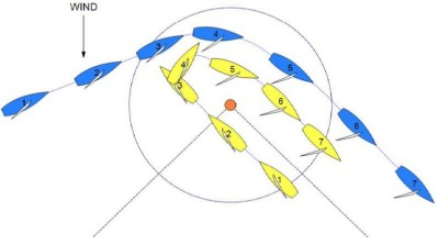 Blue on port tack and Yellow on starboard tack are approaching the windward mark on a collision course. The umpires agree that Yellow sails beyond the point where her proper course would be to tack to round the mark. Blue tacks to starboard to avoid Yellow, but before she reaches a close-hauled course Yellow has to luff to avoid Blue. Both boats display flag Y at position 4. What should the call be?