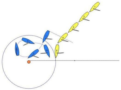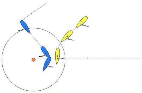 Blue, with an outstanding penalty, is clear ahead when she reaches the zone of the finishing mark. Blue luffs, tacks and bears away to a course that is more than ninety degrees from the true wind, on port tack at position 4. After position 4, Blue sails at an angle that the umpires agree is her proper course.