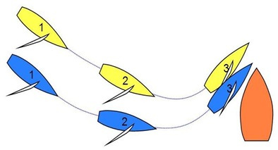 Yellow and Blue, overlapped on port tack, are approaching an obstruction which can be passed on either side.