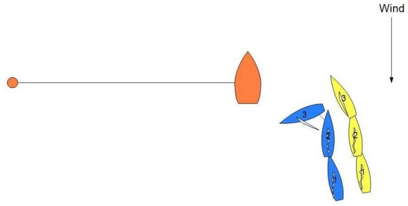 Blue is head to wind and then bears away hard by repeatedly moving her helm until she reaches a course that is more than ninety degrees from the true wind just before position 3. Should the umpires take any action?