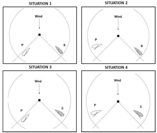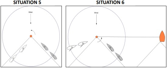 In each of the situations 1 to 6 that follow, the boats shown are on opposite tacks 'on a beat to windward' and are either below, on or overstanding a close hauled layline to the next mark of their course. This mark may be a rounding mark, a passing or limit mark, a gate mark or a finishing mark.