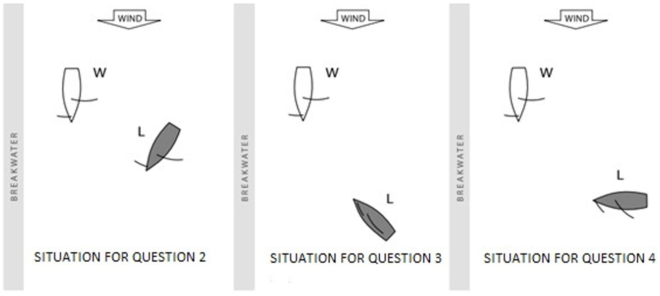 At some time after the moment shown in the diagram it will be necessary for L to either luff or bear away to avoid colliding with the breakwater. If L bears away, then the answer to this question is the same as Answer 2. If L luffs, then the answer to this question is the same as Answer 3.