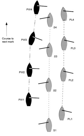 | Three boats, one on starboard tack and two on port, were running. S overtook PL and PW and passed between them as shown in the diagram. The three boats continued on slightly converging courses, as shown, until S touched first PW and then PL. PW protested S, alleging that she had broken rule 19.2(c) because PL was a continuing obstruction to PW, and S had no right to come between them. The protest committee disqualified both PL and PW under rule 10, and PW appealed. |