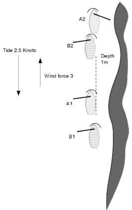 Boats A and B were running on starboard tack close to the shore against a strong ebb tide in a Force 3 breeze. At position 1, A was not more than half a hull length clear ahead of B. B blanketed A, causing A to slow and, at position 2, to gybe unintentionally. This was immediately followed by a collision, although without damage or injury, and B protested A under rule 10. The facts were agreed, and both boats were disqualified: B under rule 12 because, just before A gybed, B was too close to A to be keeping clear, and A under rule 10 for failing to keep clear of a starboard-tack boat.