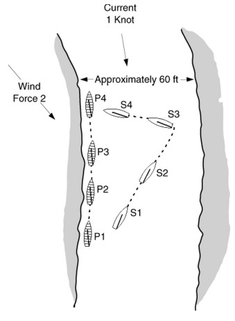P is sailing up-river, close-hauled on port tack, very close to the bank. S, unable to point as high as P, is forced to sail away from the bank. She then tacks onto starboard and immediately hails 'Starboard' to P. P sails on and, when she reaches a position at which she cannot luff without hitting the bank or bear away without colliding with S, she hails S for room.