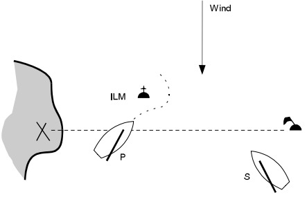 The sailing instructions stated that the finishing line was between a mast on shore and a mark, with an inner limit mark to be left to port. On the day in question, the inner limit mark lay on the post-finish side of the line. P crossed the line, and then rounded the inner limit mark as shown in the diagram. The race officer timed her as finishing when her bow crossed the line, before she had rounded the limit mark.