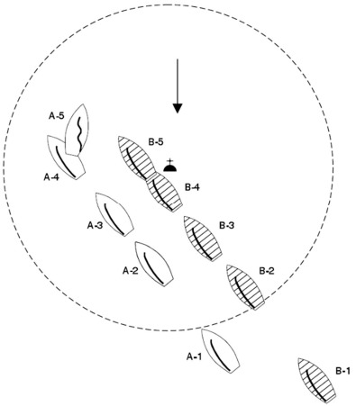 From the time A reached the zone until she passed head to wind, rule 18.2(a)(2) applied, requiring B to give A mark-room. B fulfilled this obligation until shortly before position 5, when, at the moment A passed head to wind, B’s obligation to give A mark-room ended (see rules 18.1(a)(1), (18.1(a)(2) and 18.2(b). Note that Case 132 discusses the meaning of ‘on a beat to windward’.