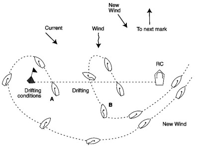 The first leg of a race on the Panama River was to windward, in a weak and fluky wind and against a strong current. Boats A and B started correctly, but the wind died and they drifted backwards. A passed outside the port end of the line, and B crossed back over the line. Later, the wind returned but from a new direction, and both boats passed to starboard of the race committee boat at the starboard end of the line and continued up the leg.